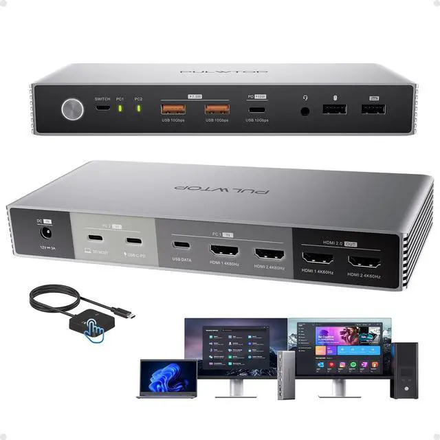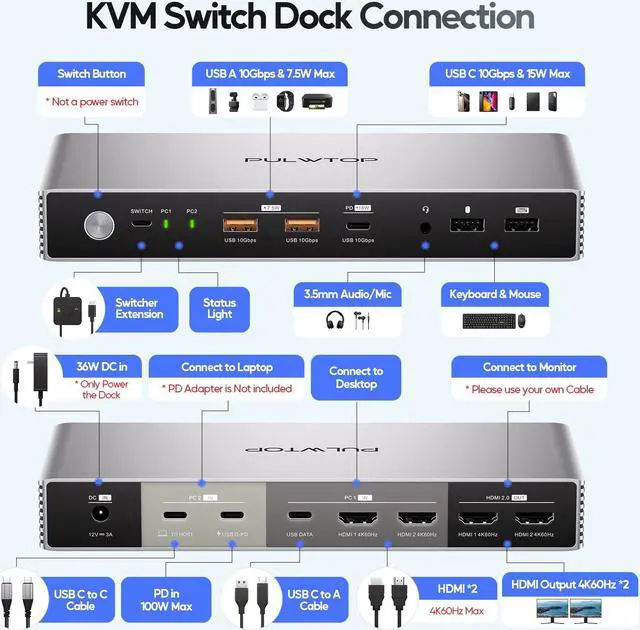 • POWERFUL KVM SWITCH DOCK - PULWTOP KVM switch for 2 computers with multiple shared essential peripheral ports, making it not just a USB switch, but a USB C docking station. Including 1 x USB-C 3.2 10Gbps with PD charging up to 15W , 2 x USB A 3.2 10Gbps with BC charging up to 7.5W, 2 x USB-A 2.0 for mouse and keyboard, 1x 3.5mm audio/mic jack, 1x switch port and 2 x HDMI outputs. Create a powerful workstation at home easier than ever
