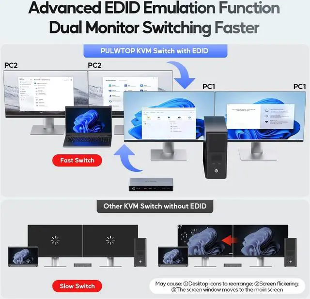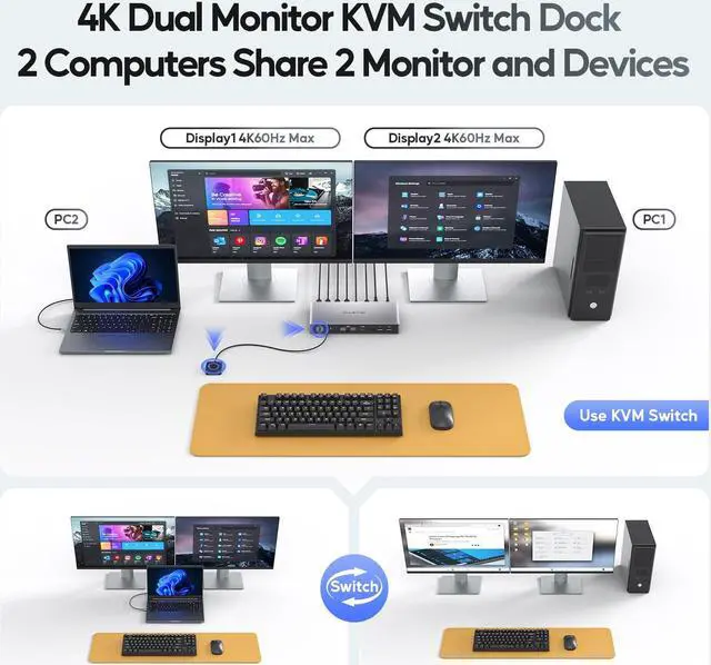 • KVM SWITCH DOCKING STATION FOR LAPTOP & DESKTOP - The KVM switch docking is equiped with 1 x USB-C (MST) input port for laptop, and 2 x HDMI + USB-C data input port for desktop computer to 2 monitors. The USB C KVM switch is also built-in with EDID function, which only takes 3-5 seconds to switch between your workstation and gaming PC, and seamlessly enjoy 2 monitors at the same time