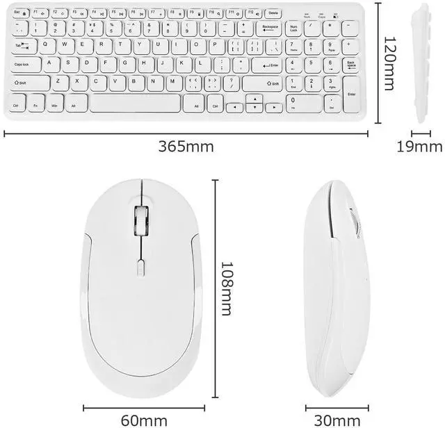 Ultra-thin, convenient to carry Compact and lightweight. Keyboard size: about 360*120*20mm, weight: about 380g, mouse size: about 60*106*25mm, weight: about 70g. Wireless thin compact keyboard with the thinnest part of 10mm. Lightweight, ultra-thin, easy to store and carry. The volume is very small and takes up little space.