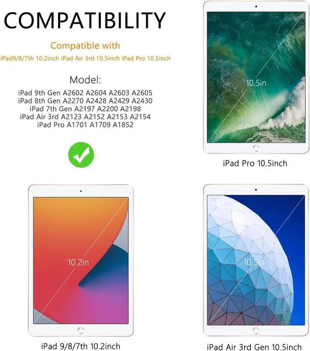 [iPad Keyboard Case Compatibility] This iPad keyboard case is designed for 10.2 inch iPad 9th generation 2021 (A2602/A2604/A2603/A2605), iPad 8th generation 2020 (A2270/A2428/A2429/A2430), iPad 7th generation 2019 (A2197/A2200/A2198), iPad Air 3rd generation (A2123/A2152/A2153/A2154) 10.5inch, iPad Pro (A1701/A1709/A1852) 10.5inch. Please check the model number on the back of your iPad before purchasing.
