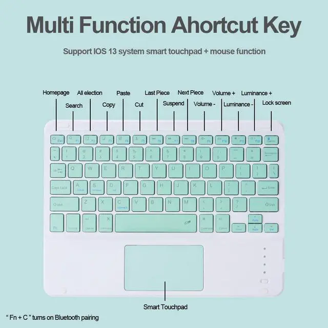 Built-in touchpad: keyboard with touchpad, support multi-finger sliding function. (Notice: To use the keyboard touchpad, Please go to the iPad accessibility setting to turn on the assistive touch function first, and Upgrade Your iPad Software to iOS 13.0 Version or above)