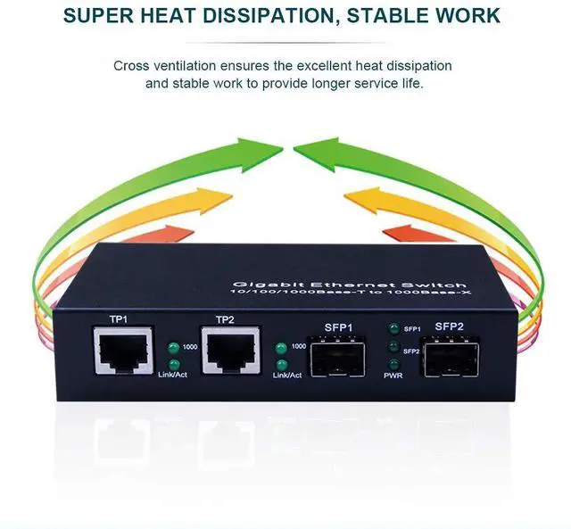 LED indicators for PWR, SFP2, SFP1, TP2 1000, TP2 Link/Act, TP1 1000, TP1 Link/Act can dynamic feedback link connection state and fault detection to easily monitor network status.