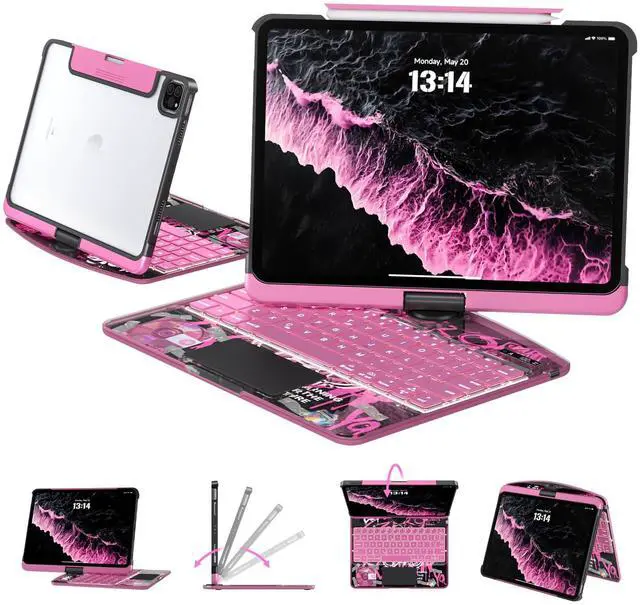 Tiaota Transparent Case with Keyboard for iPad Air 13 Inch (M3/M2, 2025/2024), iPad Pro 12.9 Inch (6/5/4/3 Gen), 7-Color Backlit, Magic Wireless Keyboard, 360°Rotating, with trackpad, Pencil Holder, Pink