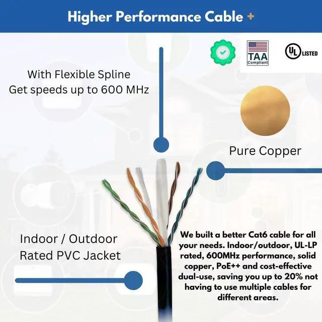 Run cable indoors and outdoors with Cat6 performance. Coming in an easy to pull box this 1000ft cable is perfect for in walls, room to room, network rooms, warehouses, outdoor cameras, access points, residential networks, gaming, riser runs, you name it this cable can do it.