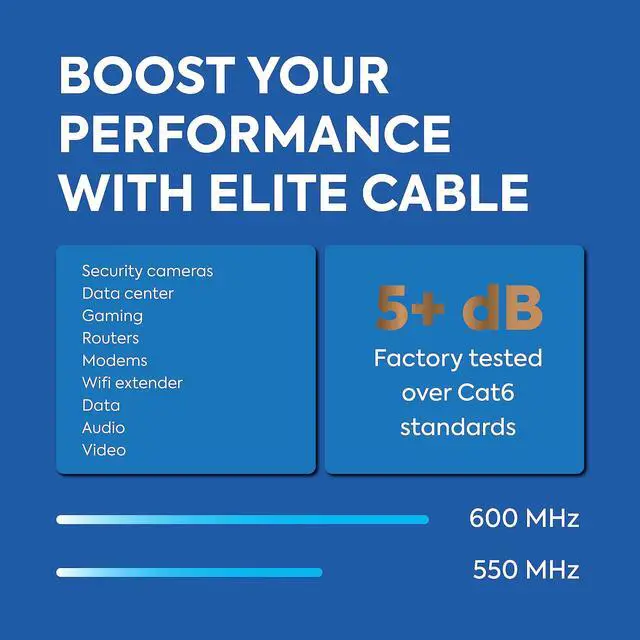 Factory tested to 600MHz and a dB rating of up to +5 over transmission performance we built this cable for high speeds and performance in all installation environments.