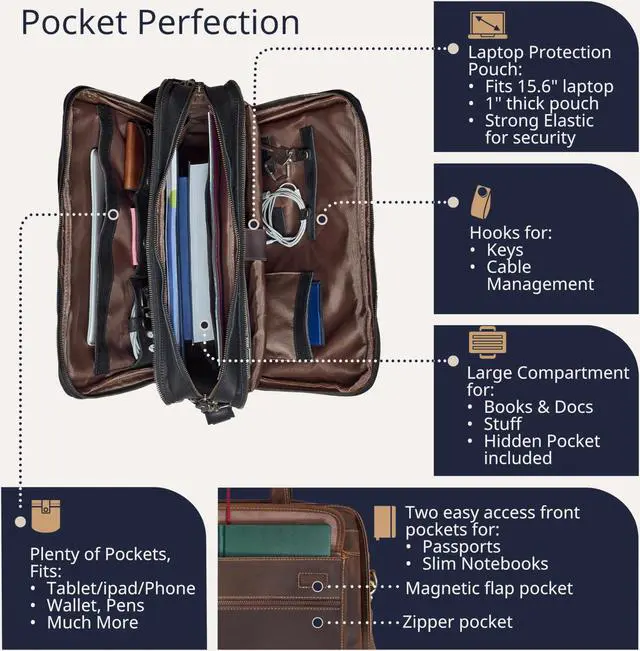 QUALITY CRAFTSMANSHIP: The commuter briefcase is constructed with fine materials and expert craftsmanship. YKK zippers, solid brass hardware, precision stitching with heavy bonded thread, and a superb internal lining will withstand many years of commuting.