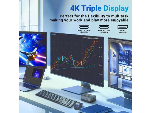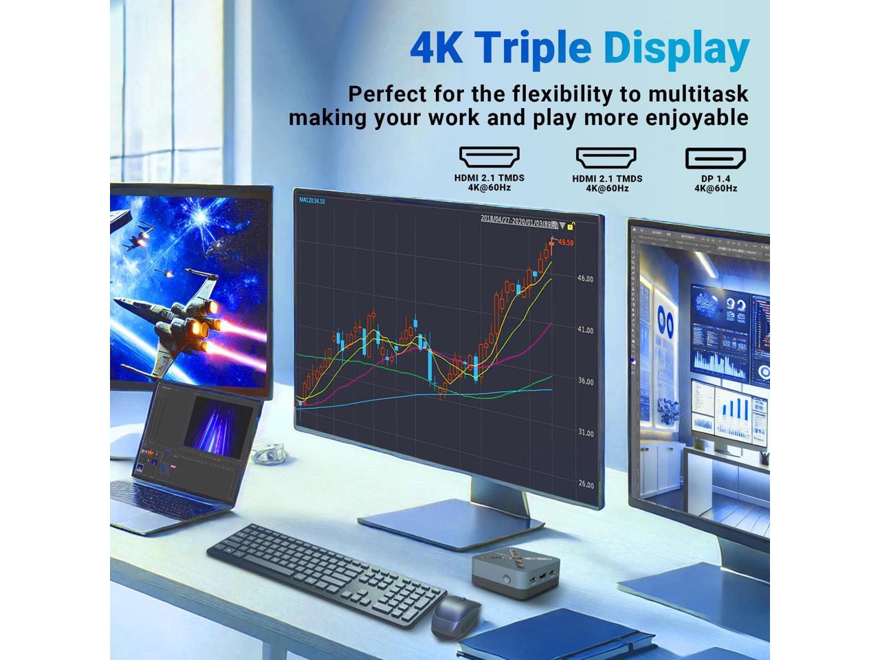 - 4K Triple Display Supports 4K resolution across three screens via 2x HDMI and 1x DP1.4, perfect for the flexibility to multitask, making your work and play more enjoyable