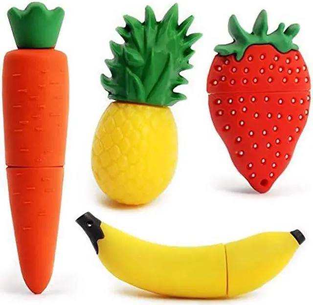 4* 32GB Fruit Vegetable Design Cute USB Flash Drive (pineapple flash drive, carrot flash drive, banana flash drive, strawberry flash drive). Use A-class chip, can be erased repeatedly for 100,0000 times.Durable data storage. Storage, Shock proof and electromagnetic proof. Fast speed in write/read transfer