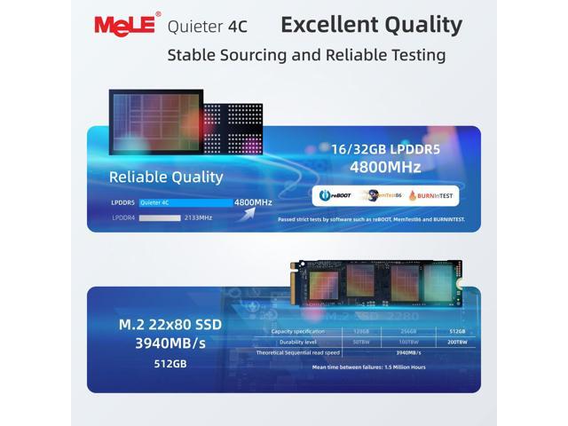 - Twin Lake N150 Processor & Unstoppable PerformanceMeLE New released Quieter4C micro pc is powered by faster N150 processor (up to 3.6GHz), 4 cores, 4 threads, 6MB L3 Smart Cache with TDP 8W. N150 mini pc delivers more than 35% higher performance than N5105/N5095 CPU, with lower power consumption, and it can support 7/24 stable performance. Ideal for business, industrial, office, education and entertainment.