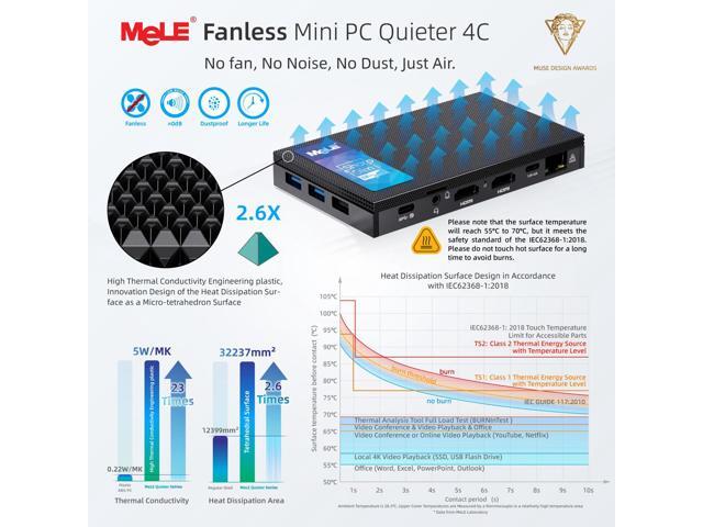 - Fanless Design & Ultra Small Size Mini desktop computer adopted fanless design of 0dB noise offers a silent and comfortable experience. Quieter4C small form factor pc in size only 5.2x3.2x0.7inch and 0.44Lb. This quiet pc can be easily carry out for a business trip. Space saving design comes with a VESA bracket, it can be mounted on the back of a TV/monitor. To improve the tidiness of office desk space. Good choice for light Office work, conference, web browsing, online education etc.