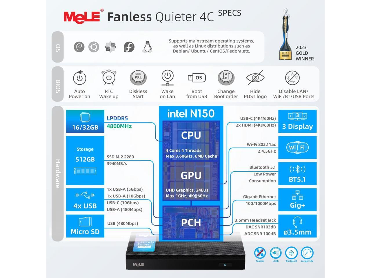 MeLE Quieter4C N150 Fanless Mini PC (up to 3.6GHz 4C/4T) 32GB LPDDR5 512GB Micro Desktop Computer, Support 4K Triple Display, Dual HDMI, All-in-One USB-C WiFi 5 BT5.1 Ethernet