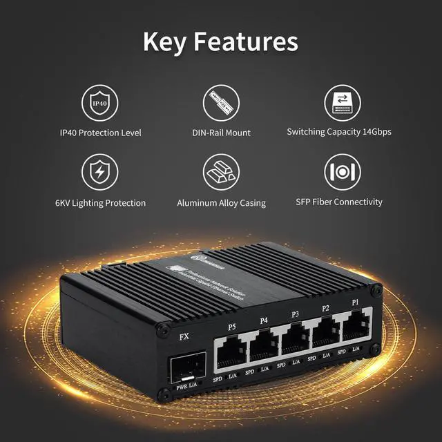 Mini industrial grade Gigabit 1 optical and 5 electrical SFP port switch, including 1 Gigabit SFP slot and 5 10/100/1000M adaptive RJ45 electrical port.