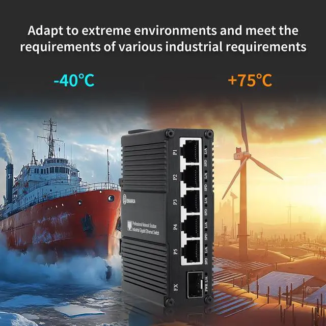 Industrial-grade EMC design, with wide operating temperature range from -40°C to 75°C. The Ethernet port supports both half-duplex and full-duplex mode.