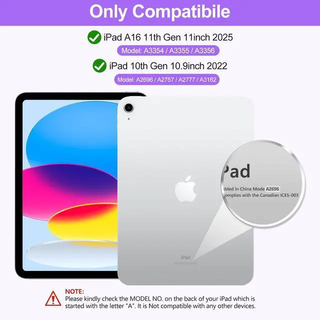 Compatibility ModelThis keyboard case compatible with iPad A16 11th Gen 11inch 2025(Model: A3354/A3355/A3356) & compatible with iPad 10th Gen 10.9inch 2022(Model: A2696/A2757/A2777/A3162). Not compatible with any other models. *Please check the model number starting with "A" on the back of your tablet before purchasing. ( NOTE: Pencil and iPad not included)