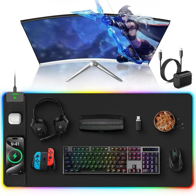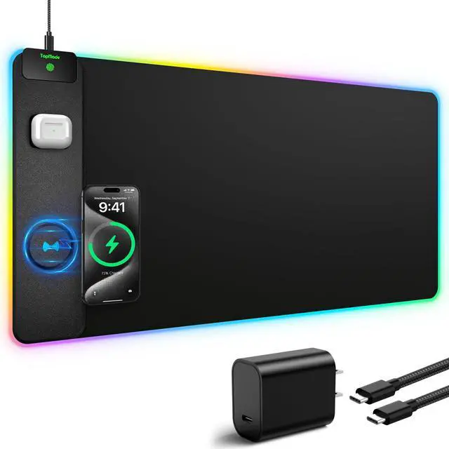 Extra Large 5-IN-1 Wireless Charging RGB Mouse Pad for Desk TopMade New Extended RGB Mousepad is 31.5" x 15.8", the extra large usable area covers your desk keyboard, mouse, and other items while gaming or working, and combines 5 functions of phone charging, AirPods charging, RGB light, desktop protector and mouse pad in one, allowing you to charge your iPhone and AirPods while using the gaming mousepad without the need for additional cables interfering with your desk, keeping your desk neat and tidy