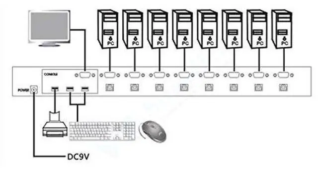 One console controls up to 8 computers from one monitor, keyboard and mouse.
