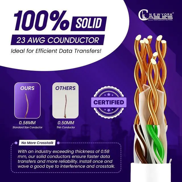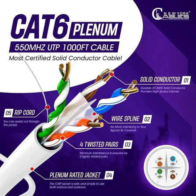 : This is not just any Cat6 ethernet cable. It is a lightning-fast Cat 6 Plenum Ethernet cable made with state-of-the-art high-end materials. With a thick plenum jacket and solid conductors, it supports up to 10 Gigabit speed and 550MHz bandwidth. Whether for gaming, streaming, or heavy traffic, this Cat6 cable delivers data flawlessly.