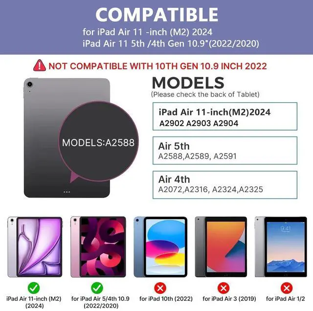 Case Keyboard Only Compatible for iPads Air ModelCompatible for iPad air 11 inch M2 2024 (A2902/A2903/A2904) & air 5th Generation 2022 (A2588/A2589/A2591) & air 4th Generation 2020 (A2316/A2324/A2325/A2072) these 3 iPads models. Please check Compatible for iPads model before placing an order.NoteThis case keyboard is NOT suitable for iPad 10th Generation (10.9",2022)