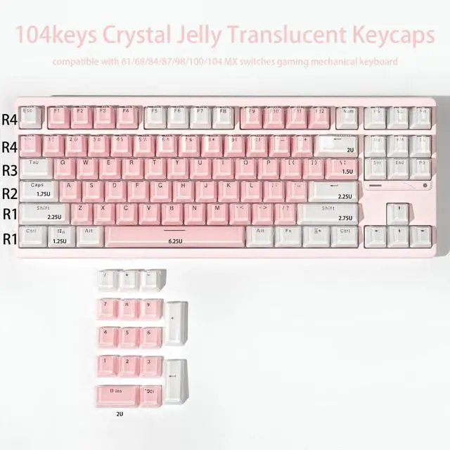 Pink Crystal Keyboard Key Caps:The keycaps is made of transparent jelly PC material and ABS material, these keycap are durable and long-lasting. Double layers design enhances the aesthetics of your keyboard.Compatible with keyboards featuring RGB lights, these keycaps allow you to customize the lighting effects for a stunning visual display.