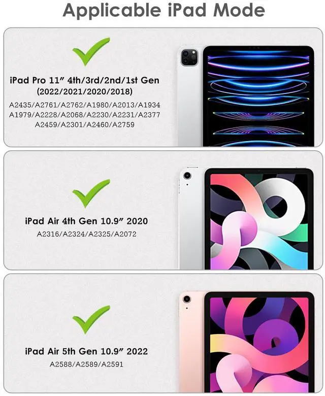 Compatibility - Designed for Apple iPad Pro 11" 2022&2021&2020&2018 (Model Number: A2377/A2459/A2460/A2228/A2068/A2230/A2231/A1980/A2013/A1934/A1979).iPad Air 4 (Model Number:A2316/A2324/A2325/A2072). Also Fit Air 5 (Model Number:A2588/A2589/A2591)
