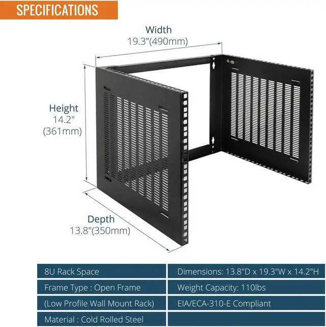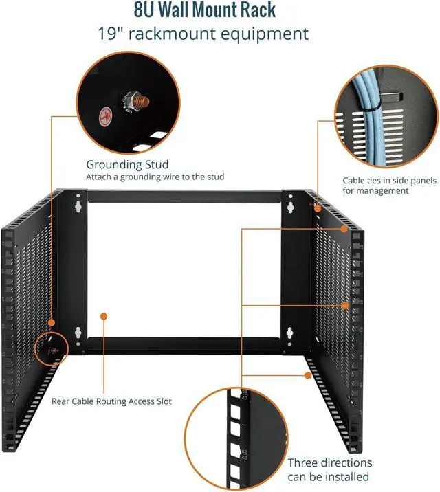 Application:EIA/ECA-310-E Compliant;wall mounted 8u rack fits all 19" racks and cabinets to hold various IT, network, and AV equipment;wall mount rack available in 4U, 6U, and 8U to choose