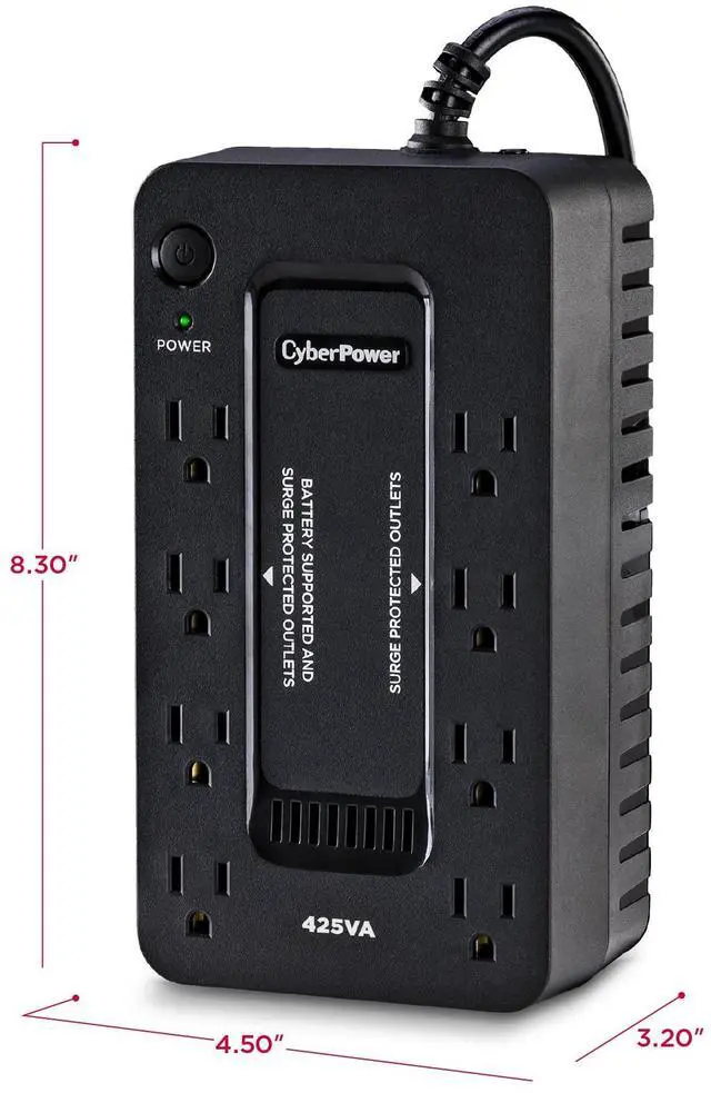 The CyberPower ST425 Uninterruptible power supply (UPS) system provides battery backup and surge protection for lightning-induced surges and other power events that can damage electronic equipment. This unit delivers enough battery backup to power connected electronics through utility power failure and enough runtime to perform a graceful shutdown to protect against the loss of data and damage to valuable electronics during longer outages. Including a sleek design, this UPS is perfect for all your home office and entertainment needs, including computers, gaming consoles, and Broadband routers. With a 75K USD lifetime connected equipment guarantee and a three-year warranty, you can trust CyberPower commitment to the quality of this battery backup with surge protection.