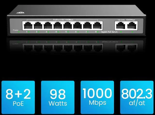 [8x PoE Gigabit Ports + 2x Uplink Ports]: Unmanned PoE switch with 8 10/100/1000 Mbps RJ45 PoE+ ports and 2 Gigabit Ethernet Uplink port, 8 PoE+ ports providing up to 30W per port, total PoE power budget 96W.