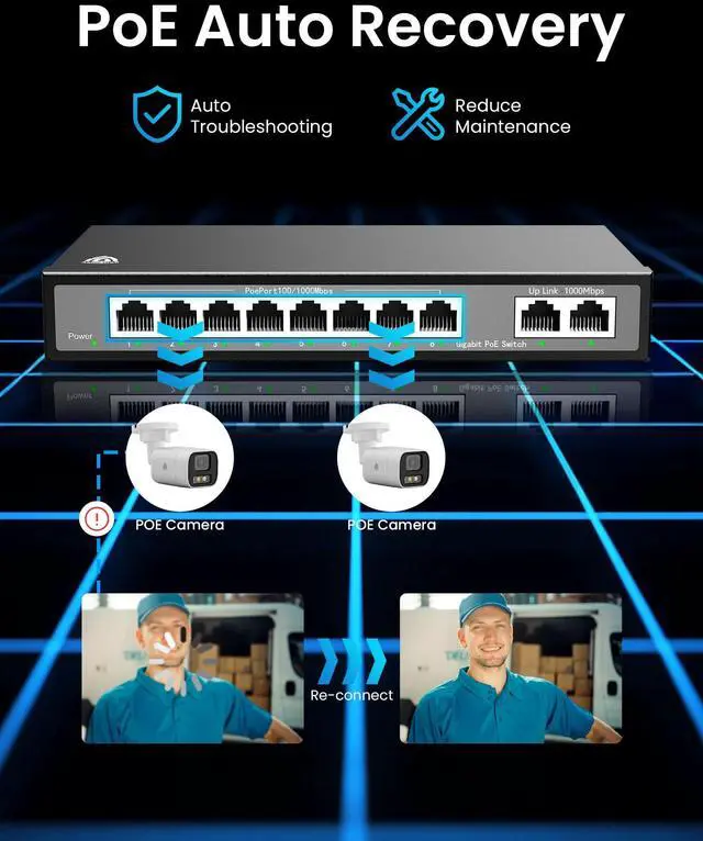 [PoE Auto Recovery]: This 8 port gigabit poe switch equipped with professional poe chip, it can intelligently detect