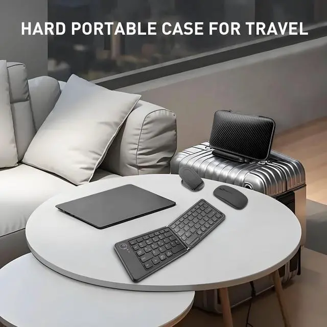 Foldable Bluetooth Keyboard and Mouse for TravelFoldable keyboard and mouse combo comes with a hard carrying case(Size:7.1x4.7x1.6 in) to store and protect the keyboard and mouse.Designed with small size and light weight, easily carried in your backpack. Along with foldable stand holds for phone and tablets, makes it perfect for your travel or business trip.