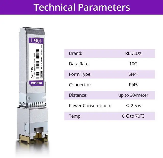 Easy to UseInsert this 10GBase-T SFP+ RJ45 module into a 10G SFP+ port, then connect a CAT6a/CAT7 RJ45 Copper cable into the RJ45 port. 3W Power Consumption. Avoid High Temperature Environments.