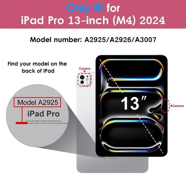 Compatibility - Specifically Designed for iPad Pro 13-inch (M4) 2024 released (Model Number: A2925/A2926/A3007).Please check back bottom of your iPad to find the model number