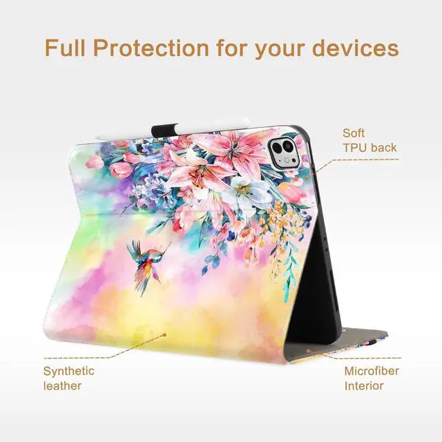 Vimorco Case for iPad Pro 13 Inch M4 2024, Flower for iPad 13 Pro Case for Girls Women, Pu Leather Protective Adjustable Stand Cover, Hand Strap, Card Pocket, Pencil Holder, Hummingbirds & Flowers