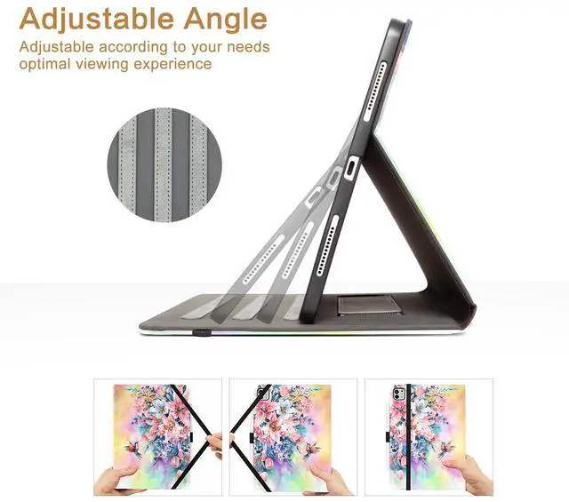 [Precise Cutouts & Adjustable Angle & Smart Auto Sleep/Wake]: Precise cutouts let you access to all ports, speakers, controls and cameras. Built-in pencil holder on the soft back cover for you to grab or carry it easily and conveniently. With three anti-slip stripes design for the iPad to sit in to stabilize it, never slips when you have it in a tilting position. Built-in magnetic strip ensure it automatically wakes your iPad when opened and puts it to sleep when closed to save batter