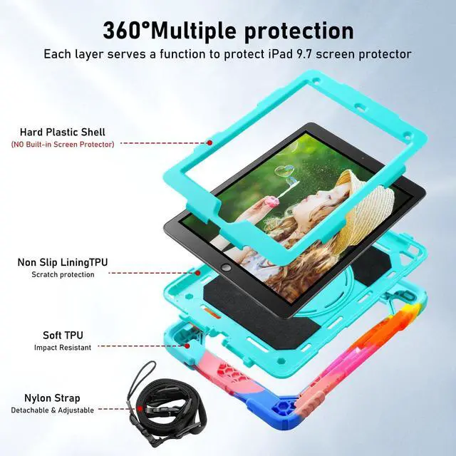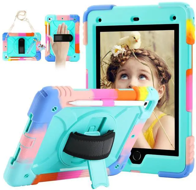 for iPad 6th Generation/iPad 5th Gen/iPad Air 2/iPad Pro 9.7" Case with Cute Key Chain, Rugged Protective Case with Rotating Stand & Shoulder Hand Strap for iPad 6th/5th/ Air 2 (Rainbow Aqua)