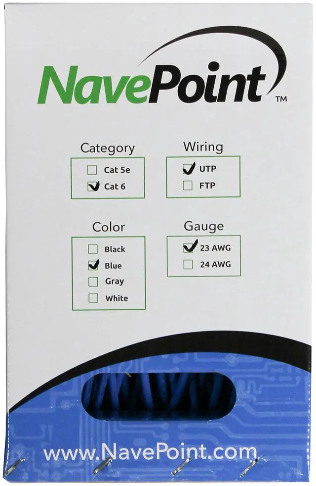 NavePoint's Category 6 CCA UTP Bulk Ethernet Cable is the perfect solution for wiring your home or office. This cable is designed to provide superior performance for your high bandwidth applications including computers, routers, VoIP phones, IP cameras, printers, gaming consoles, routers, ethernet extenders, and switch boxes. Made from professional grade materials, this cable is available in a variety of lengths and colors.