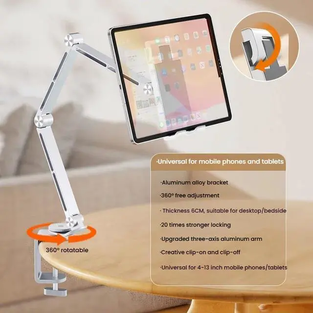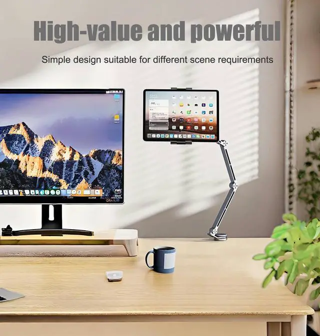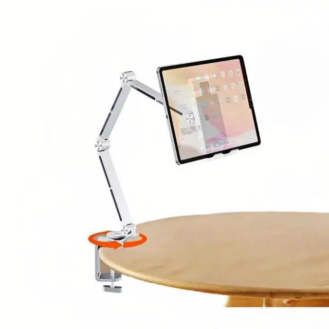Adjustable Viewing Angles: Featuring a 3-section long arm and 360° rotating baseFeatures a multi-angle design that allows for 360-degree rotation and adjustable height, providing the perfect viewing angle for watching videos, reading, video conferencing, or browsing. The tablet mount easily folds flat for convenient storage and portability, making it perfect for use at home, in the office.
