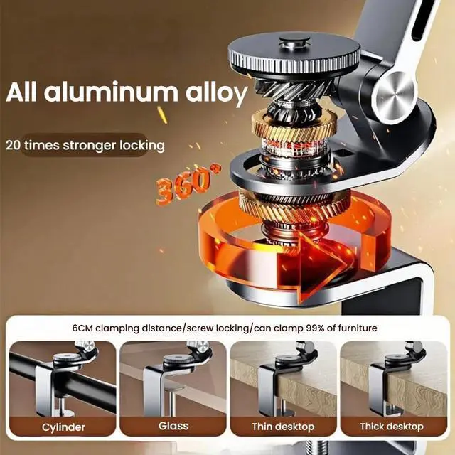 High quality: all-aluminum alloy lazy bracket, surface matte texture, base 360° rotating comes with mechanical sound, chuck can be clamped and placed design, for various purposes, chuck base all has high-quality silicone pad design, anti-slip and wear, protecting furniture and equipment.