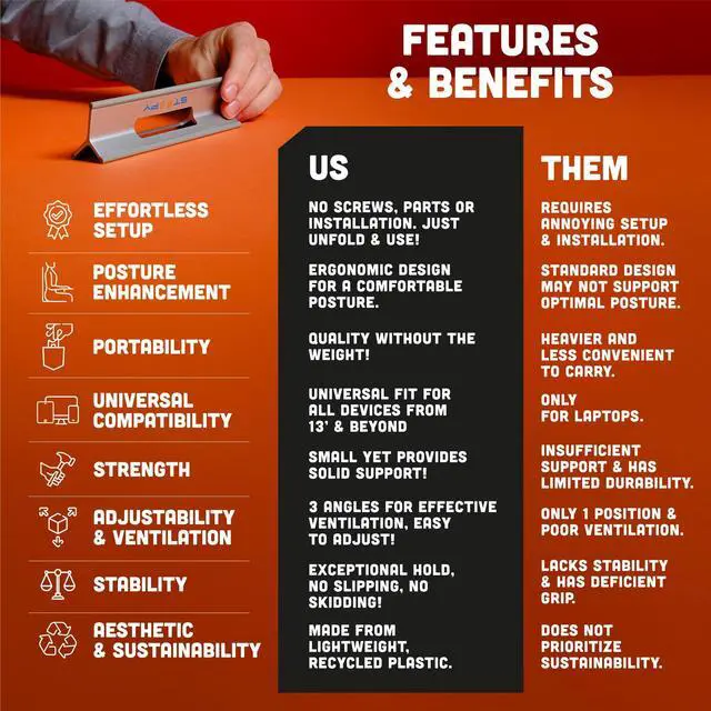 SETUP'S A BREEZE - Just unfold and gono screws, no hassle. Instant use, instant time saver! Steepy desk laptop stand is a travel laptop stand made out of strong and durable recycled plastic, with rubber edges to provide the sturdy and stable support your device needs and prevent it from sliding or skidding
