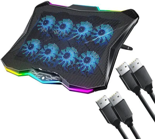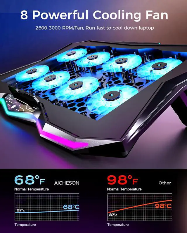 AA3-8FAN: 10 modes with fingerprint touch control for easy adjustments, it adds a touch of style to your gaming setup and creates a visually appealing environment. Turn off side RGB lights with a long press. Equipped with 2 USB ports, measuring 15.75" x 11.77" x 1.2", the diagonal length is 18", the gaming computer cooling stand is compatible with 14" to 17.3" laptops