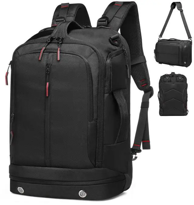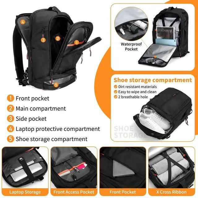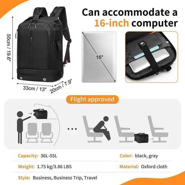 Large Capacity Design -- The main bag of this backpack can hold 7-10 days of travel items, and there are dry and wet separation bags inside. It has a separate computer compartment for a 16-inch computer and a separate shoe compartment (can hold US12 size shoes). The zipper pockets on both sides can store small items and water bottles. The front pocket can hold documents and other items. The back zipper pocket can hold important documents and items.