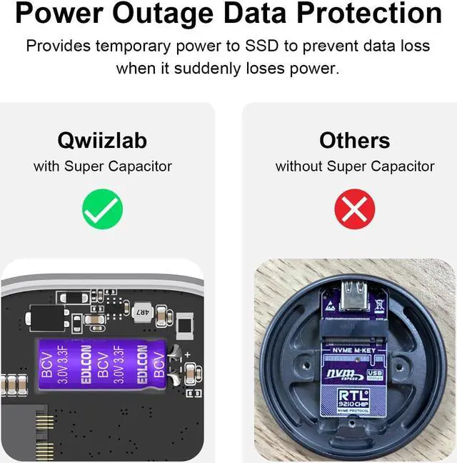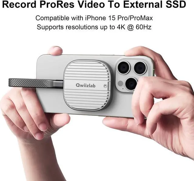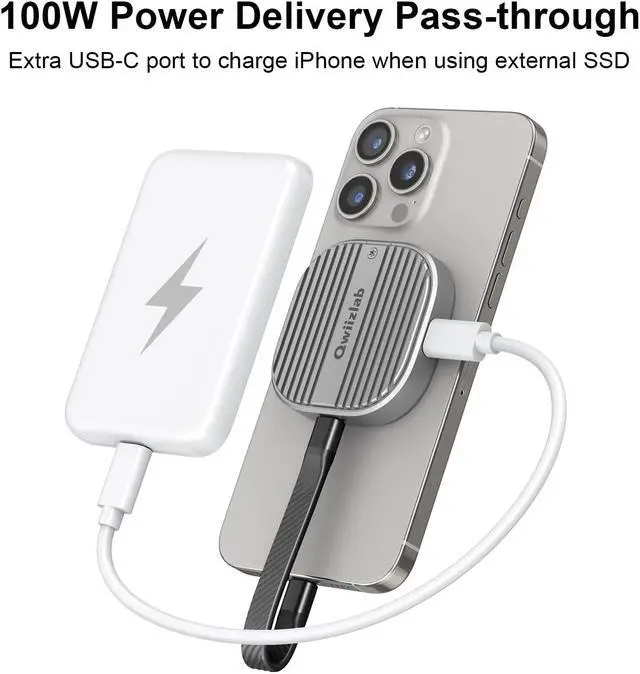 Product 1: QWIIZLAB Magnetic M.2 NVMe SSD Enclosure with Magsafe for iPhone 15 Pro Max ProRes, 10Gbps USB 3.2 Type-C, Fits 2230 M-Key up to 2TB, Supports PCIe UASP, Rugged Aluminum Chassis (Gray)