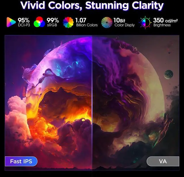 Vivid Color Accuracy: 95% DCI-P3 Wide Color GamutExperience true-to-life colors and deeper contrast with a wide 95% DCI-P3 color gamut and 10-bit color depth, ideal for gaming, movie watching, and creative work.