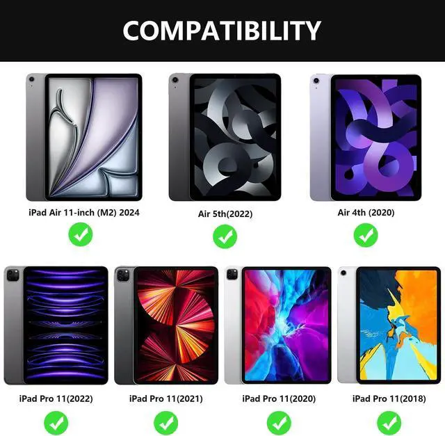 CompatibilityThe keyboard case is designed for iPad Air 11-inch (M2/M3) 2024/2025(A2902/A2903/A2904),for iPad Pro 11 inch 4th Generation 2022 (A2435/A2761/A2762), for iPad Pro 11 inch 3rd Generation 2021 (A2301/A2459/A2460),for iPad Pro 11 inch 2nd Generation 2020 (A2228/A2068/A2230/A2231) ,for iPad Pro 11 inch 1st Generation 2018 (A1980/A2013/A1934),and for iPad Air 5th Generation 2022 (A2588/A2589/A2591),for iPad Air 4th Generation 2020 (A2072/A2316/A2324/A2325).