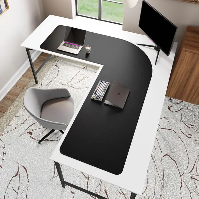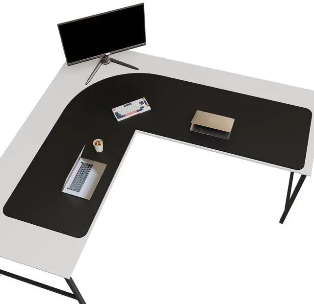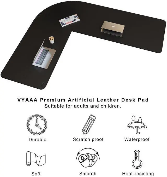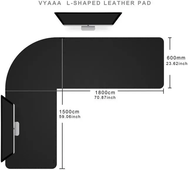 L-shaped PU Leather Desk Pad: Vyaaa unique design L-shaped Leather Desk Mat with size (59"+70.8") x 23.6"/ (150+180)× 60 cm, perfectly protects corner desk tops and provides plenty of space for multiple monitors or gaming devices. Note: Inside corners are straight, outside corners are curved.