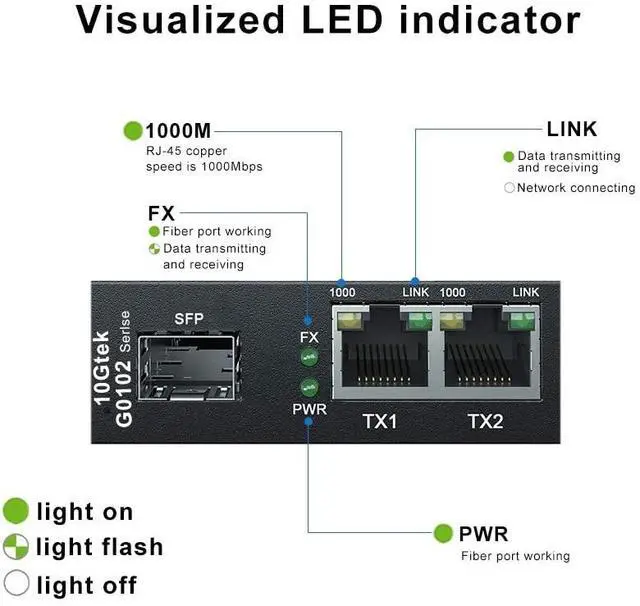LED indicators for PWR, FX, 1000, TX1 LINK, 1000, TX2 LINK can dynamic feedback link connection state and fault detection to easily monitor network status