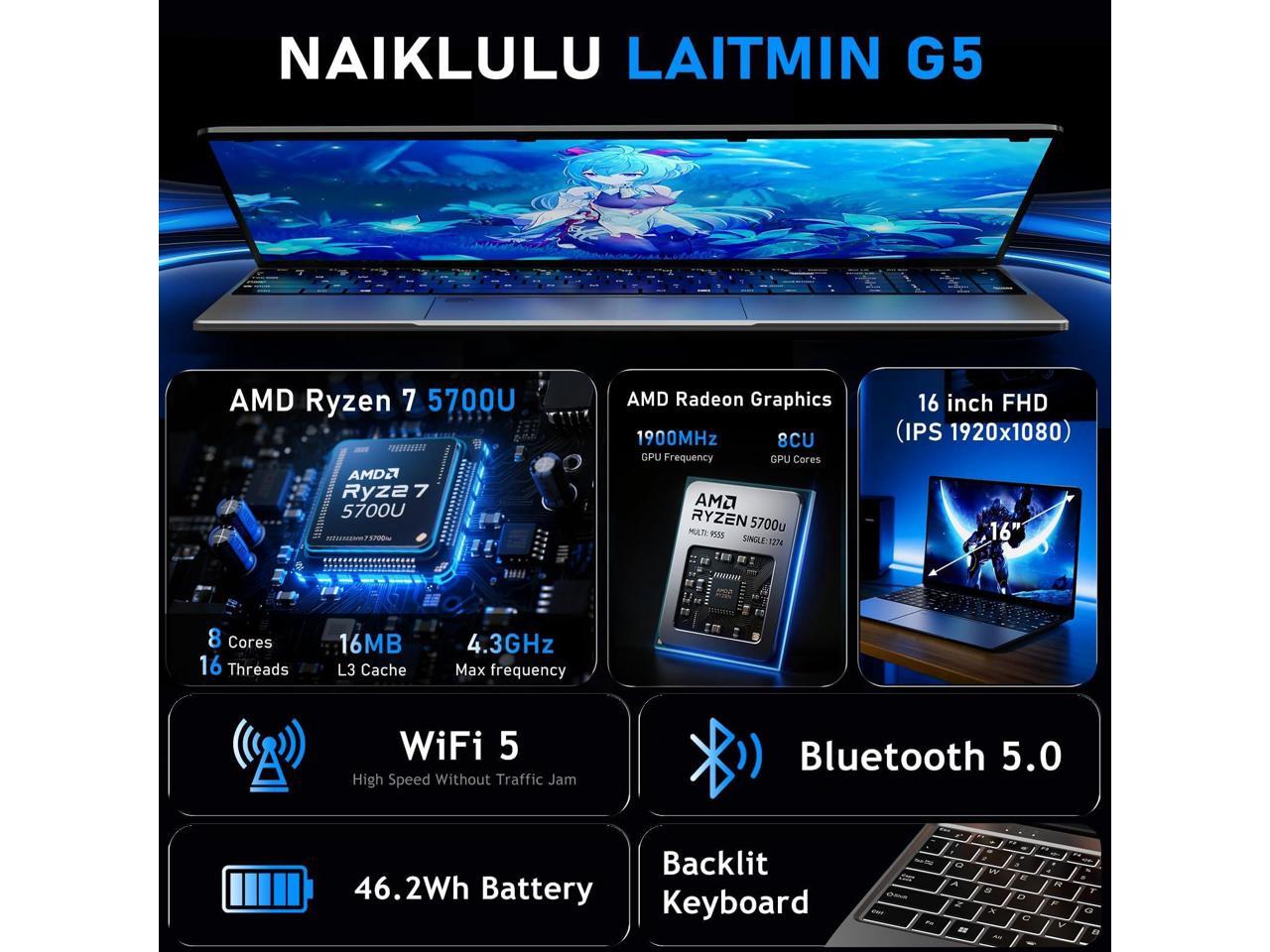 NAIKLULU Gaming Laptop, 15.6 Inch Lap Top Computer 2025, Win 11 Pro, Ryzen 7 5700U Processor, 32GB RAM 1T SSD, Backlit Keyboard, FHD Display 1920 * 1080P, WiFi 5, HDMI, for Student, Office, Business