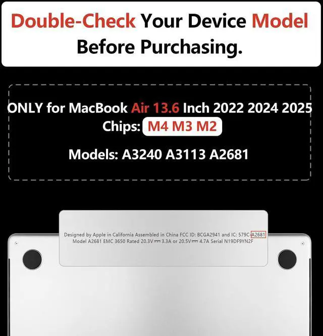 ATTENTION -- Please kindly check the model number "Axxxx" on the back of the laptop before your purchase, make sure you choose the exact same model number as the listing title stated "A3240 or A3113 or A2681". The case is not compatible with any other models the above unmentioned