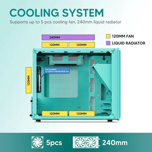 Superior Cooling Options: Supports up to 5×120mm fans and a 240mm top radiator, ensuring stable temperatures for gaming PCs and high-performance systems