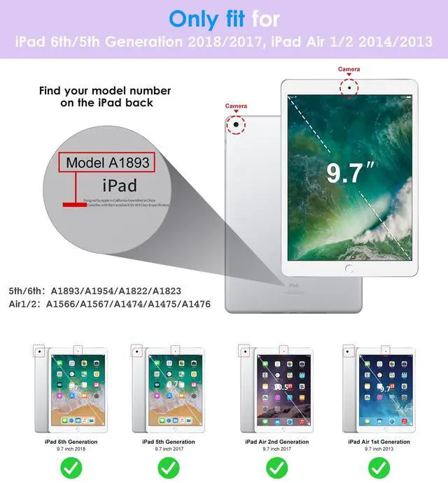 Specifically designed for Apple iPad 6th/5th Generation 9.7 Inch Tablet 2018/2017 Release (Model Number: A1893/A1954/A1822/A1823), also fit iPad Air 2/1 2014/2013 Released (Model Number: A1566/A1567/A1474/A1475/A1476). Not compatible with any other iPad model.