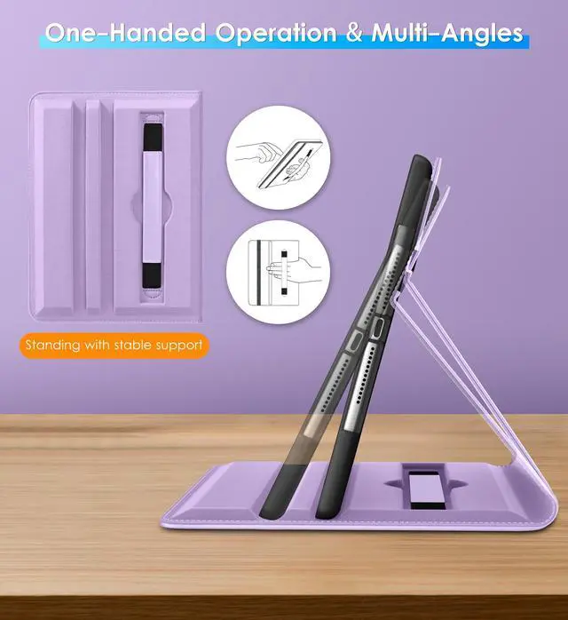 Internal embedded 360-degree rotating design, flexible rotation to any angle for comfortable watching movies or typing. Built-in leather hand strap (one-handed operation).